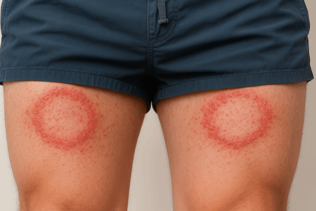 股部白癬は、赤く広がる輪状の発疹・かゆみ・皮むけなどが特徴で、太ももの内側やそけい部(股のつけ根)に左右対称に見られることが多いです。