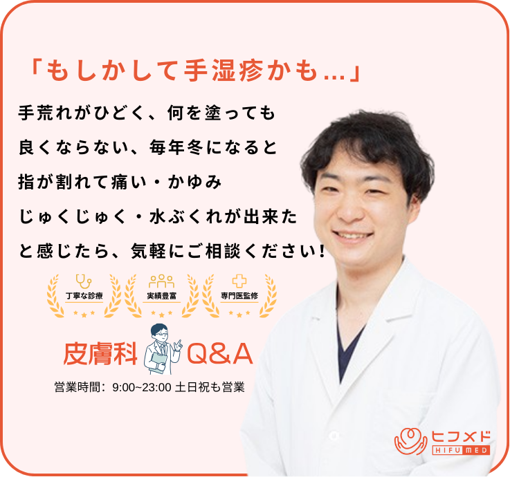 好発部位は手のひら、手の甲、指先、指の間で、特に水や洗剤に触れる機会の多い主婦、調理業、医療・介護職などに多くみられます。アトピー体質や乾燥肌の人もかかりやすい傾向があります。