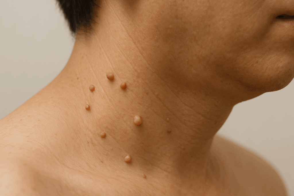 たとえば、首やわきの小型の突起は典型的な軟性線維腫であり、胸元やまぶたにも出やすく、脂漏性角化症(老人性いぼ)やウイルス性いぼと似るため、鑑別が必要になることがあります。