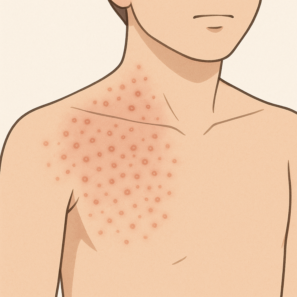 夏場の部活や熱いシャワーのあと、胸から首にかけて米粒ほどの赤いぶつぶつがびっしり出て、刺すようなかゆみに悩みました。しばらくすると消えるため放置していましたが、回数が増え夜も眠れない日がありました。