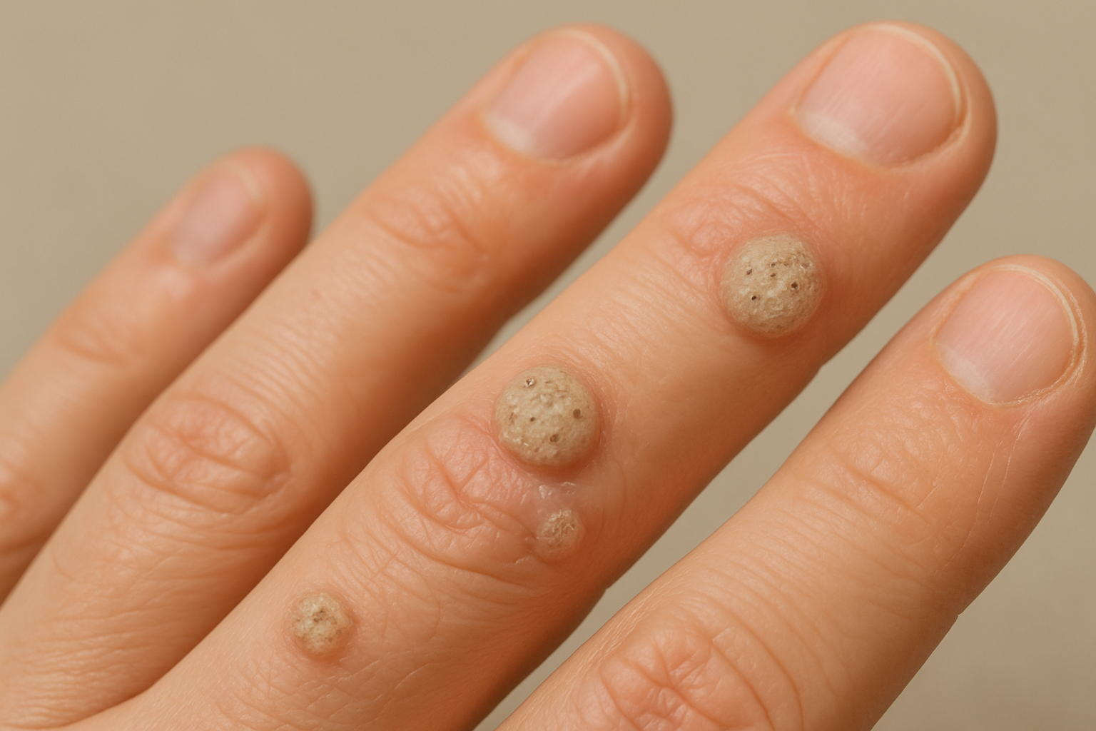 尋常性疣贅(じんじょうせいゆうぜい)とは、ヒトパピローマウイルス(HPV)の感染によって皮膚に生じる良性のいぼの総称です。主に手指や足底、顔まわりに小さく硬い盛り上がりができ、表面はザラザラして角質が厚く見えるのが特徴です。多くは痛みがありませんが、足の裏のように圧力がかかる部位では歩行時に痛むことがあります。感染後すぐには症状が出ず、数週間から数か月を経て出現する場合もあります。