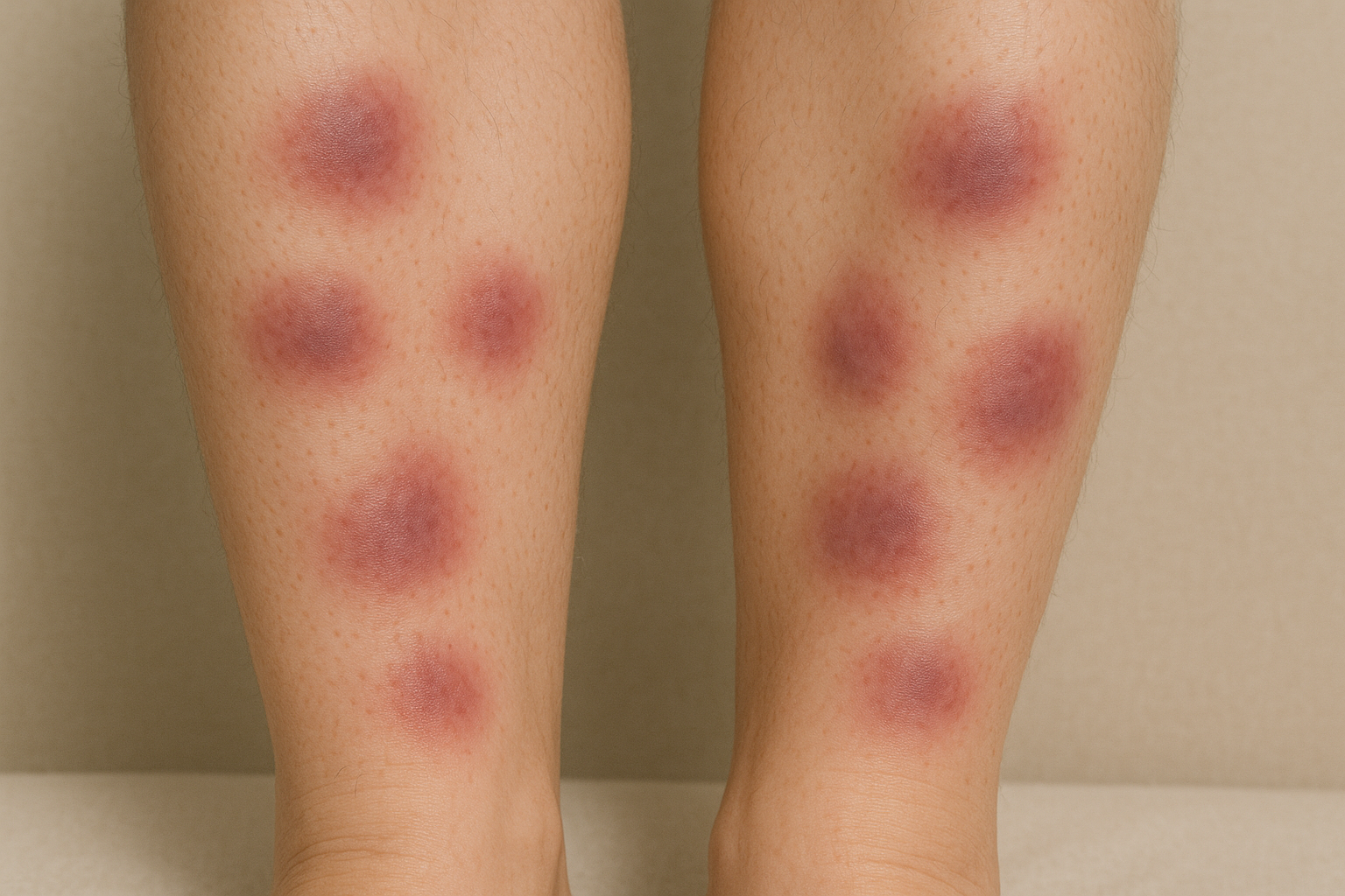 結節性紅斑(けっせつせいこうはん)とは、すねを中心に赤くて痛みのあるしこりが複数できる皮膚の炎症性疾患です。皮下の脂肪組織が炎症を起こすことで、皮膚の表面に赤〜紫色の結節(硬くて触れるふくらみ)が現れ、触ると熱をもっていて痛みがあるのが特徴です。見た目はあざや打撲のように見えることも多く、左右対称にすねの両側へ同時に出現するケースが多くみられます。