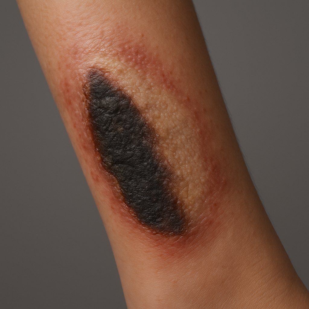 ◻︎ 水ぶくれを作らず、炭化したように見える